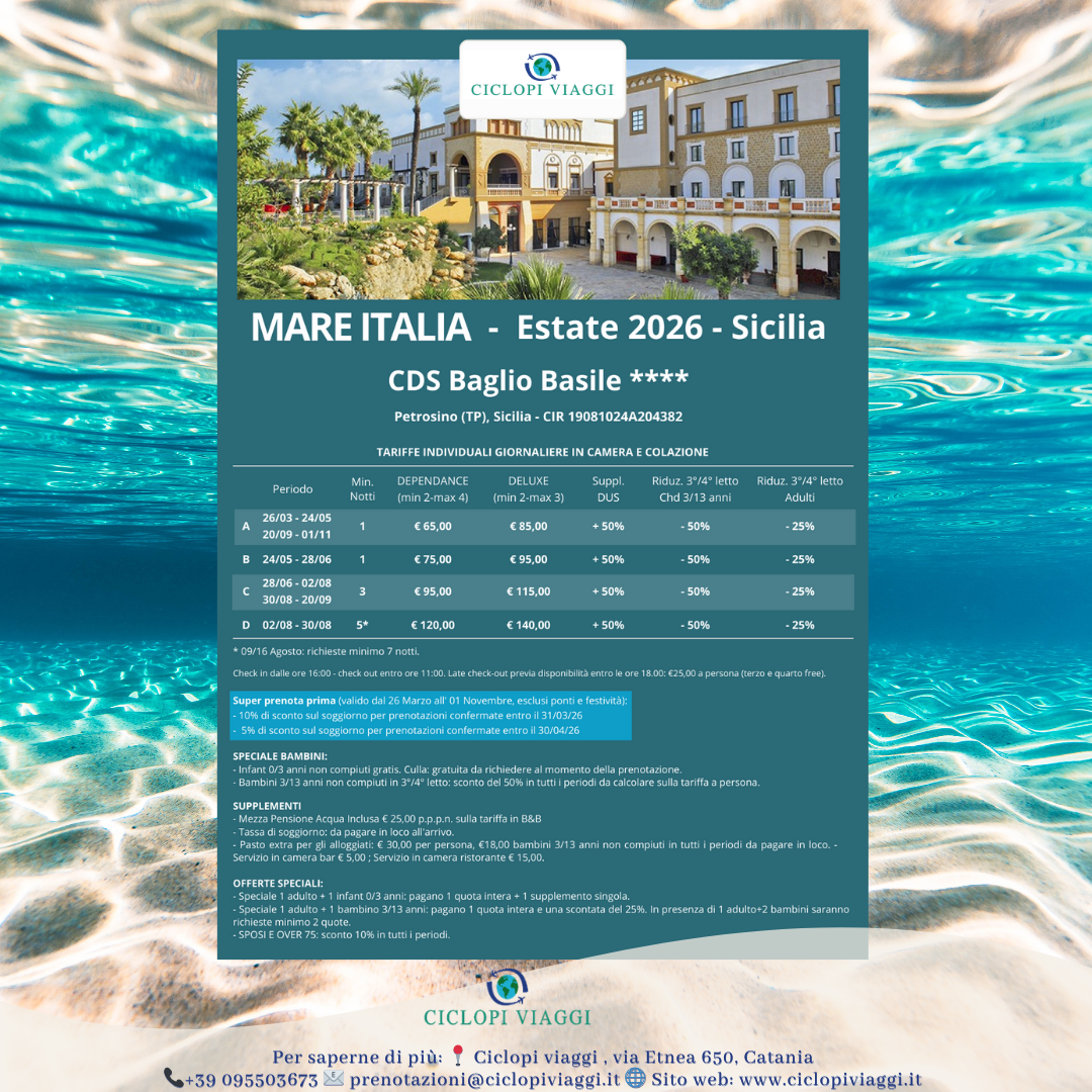Nella terra del vino e del mare, circondata da vigneti, palme secolari e oliveti, sorge l’Hotel Baglio Basile, una splendida e maestosa dimora di fine Ottocento, che domina l’intero territorio circostante. Il CDS Hotel Baglio Basile è situato a Petrosino, in un punto strategico della provincia di Trapani, da dove poter raggiungere celermente le località turistiche più belle della Sicilia Occidentale.