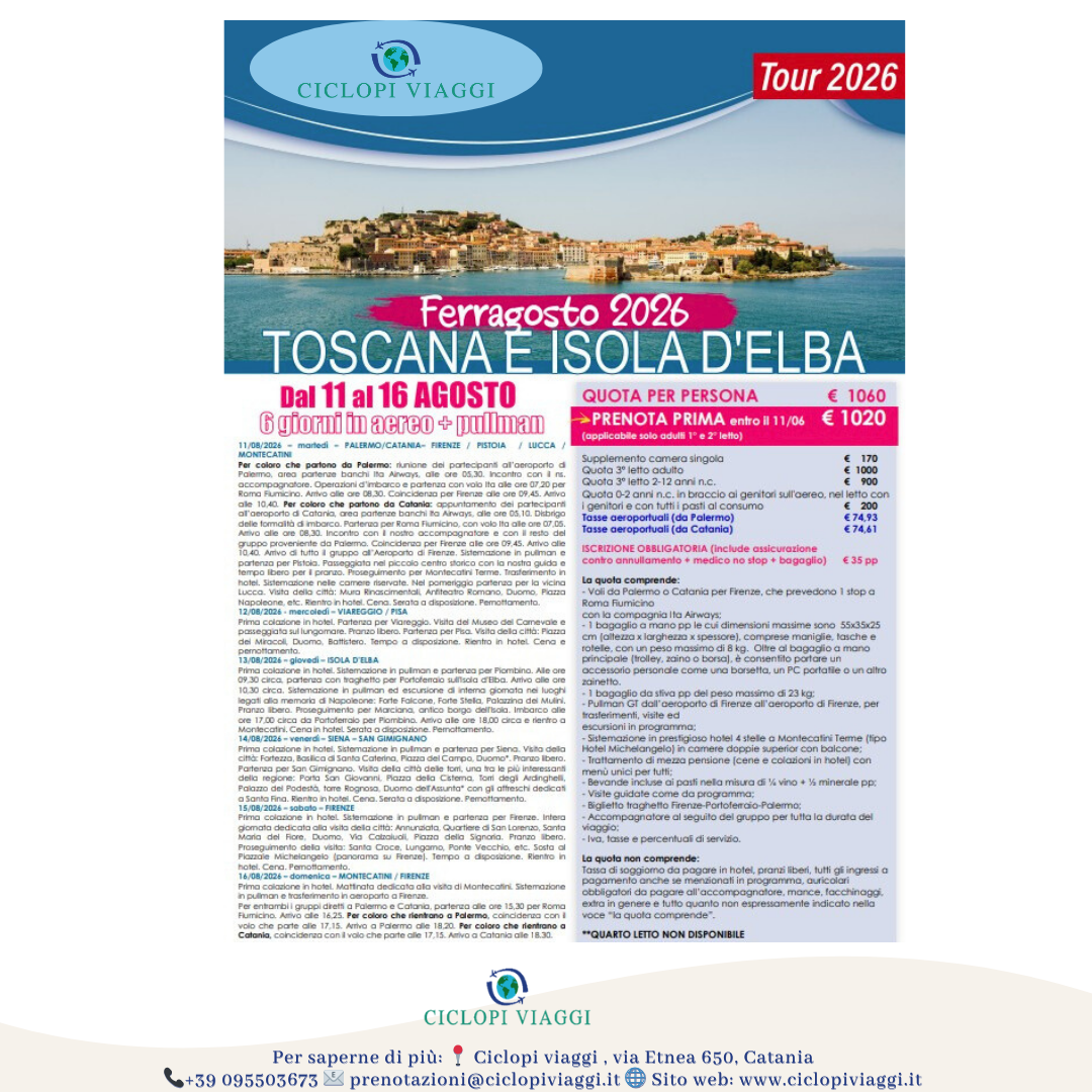 | Città | FIRENZE – PISTOIA – LUCCA – MONTECATINI – VIAREGGIO – PISA – ISOLA D'ELBA – SIENA – SAN GIMIGNANO |