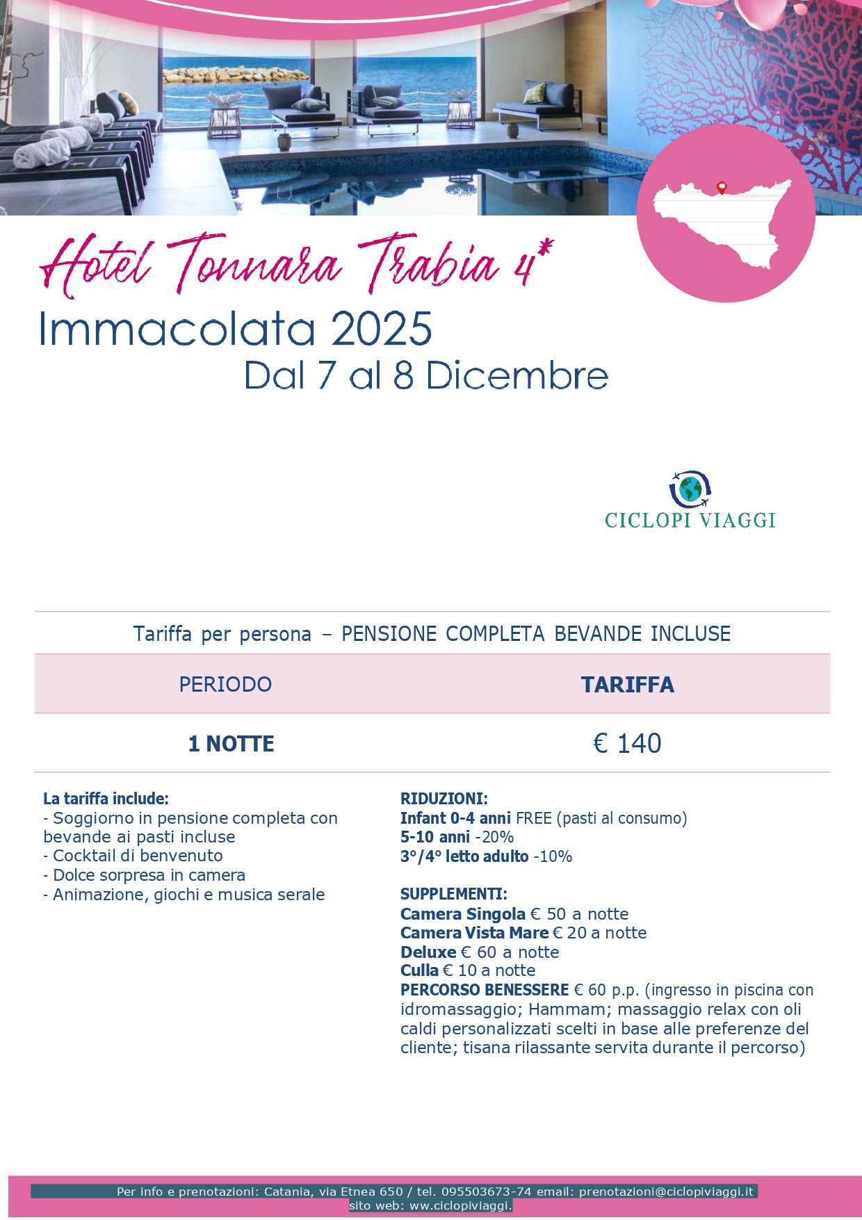 Hotel: L’Hotel Tonnara è il luogo ideale per le famiglie che desiderano una vacanza in pieno relax e divertimento, e per le coppie alla ricerca di un soggiorno di benessere e distensivo. Il Ristorante U’Rais vi delizierà con i suoi piatti dai sapori mediterranei, serviti in un ambiente elegante e raffinato. Il Centro Benessere Marina Beauty Center vi aspetta per coccolarvi con i suoi servizi rilassanti e rigeneranti.