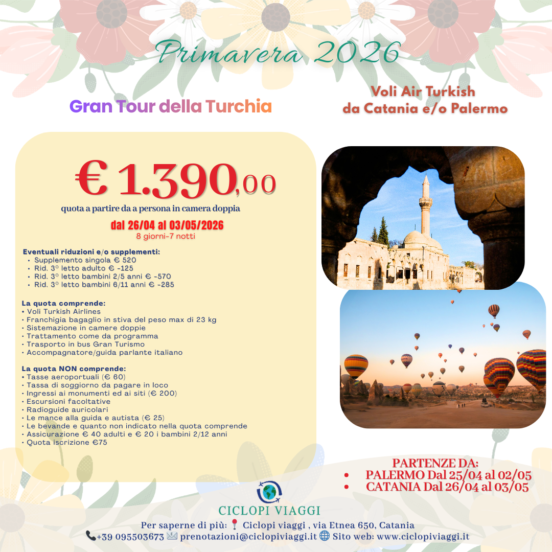 La Turchia, paese dall’enorme interesse artistico e paesaggistico, dal fascino unico e magico, dai mille volti e dalle tradizioni millenarie, una terra collocata in una straordinaria posizione, a cavallo fra Europa e Asia che unisce memorie storiche, archeologiche di grande interesse e bellezze naturali uniche. La sua atmosfera ospitale, la popolazione calorosa, l’ottima cucina, i bazar esotici, la magia di Istanbul, la splendida Cappadocia sono solo alcune delle particolarità che la caratterizzano e che renderanno il vostro viaggio indimenticabile.